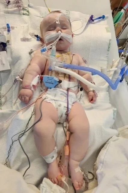 d-transposition of the great arteries, meaning his aorta and pulmonary artery were attached to the wrong sides of the heart. He had a large ventricular septal defect - a hole between the two sides of his heart. He also had pulmonary stenosis - his pulmonary valve was narrow and thickened. He would need open heart surgery to fix all of these issues. Because of his pulmonary stenosis, he likely wouldn’t be a candidate for the typical surgery for d-TGA (the arterial switch operation), and would need a different procedure called the Nikaidoh at 4-6 months of age, and would require follow up surgeries for the rest of his life.